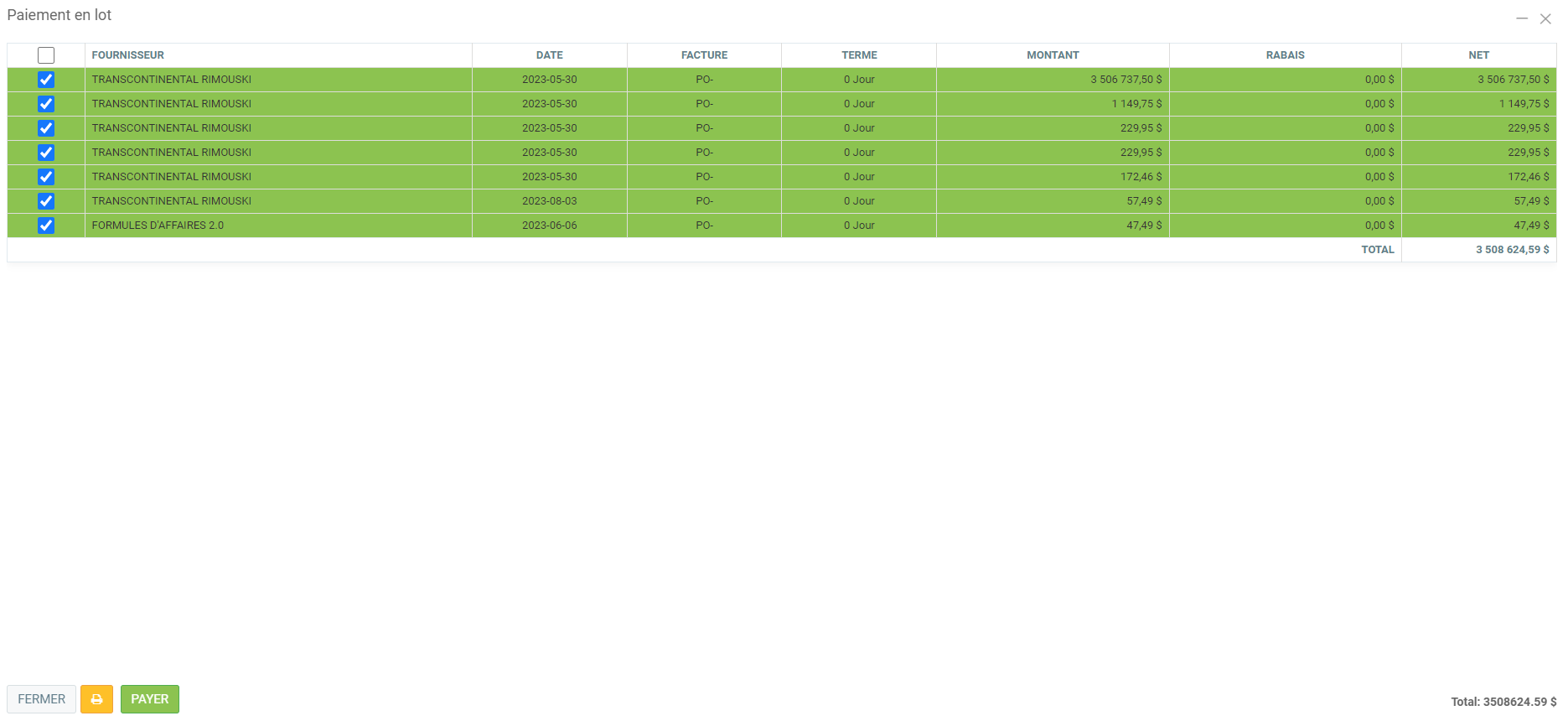 Sélectionnez ensuite les factures que vous désirez payer et cliquer sur le bouton PAYER. Cela va générer les transactions de paiements ainsi que les chèques/dépots directs selon votre choix dans la fenêtre précédente.