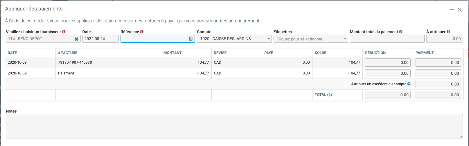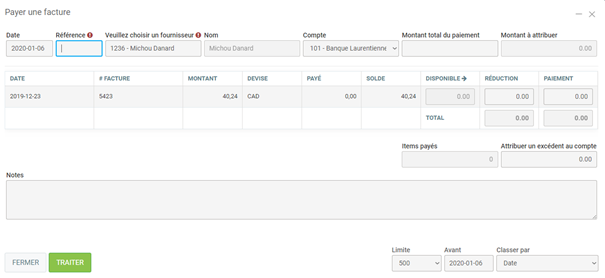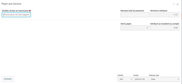 Dans le menu Fournisseurs, cliquez sur Appliquer des paiements. Vous obtenez la fenêtre suivante, qui s'intitule "Payer une facture".