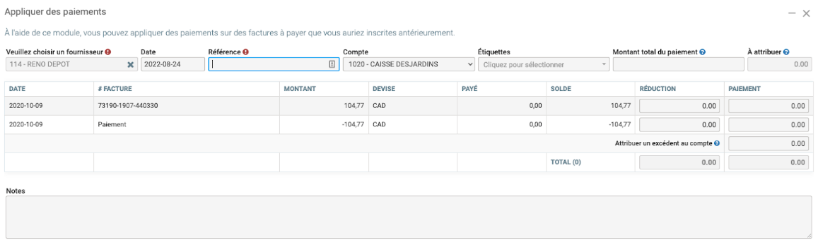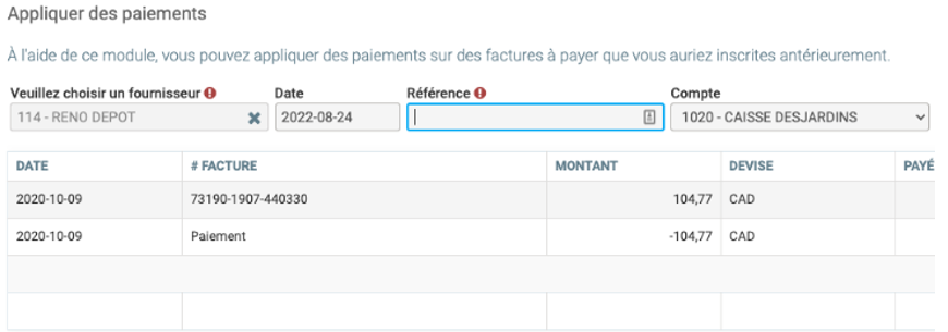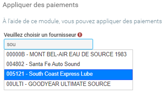 Dans le menu Fournisseurs, cliquez sur Appliquer des paiements. Vous obtenez la fenêtre suivante, qui s'intitule "Appliquer des paiements".