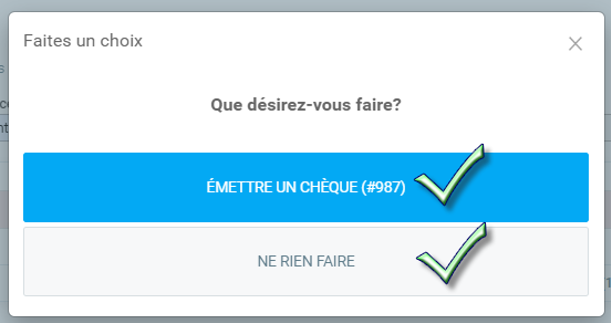 Une fenêtre de confirmation apparaît, cliquez sur mettre un chèque ou “ne rien faire pour payer la facture d’une autre façon.