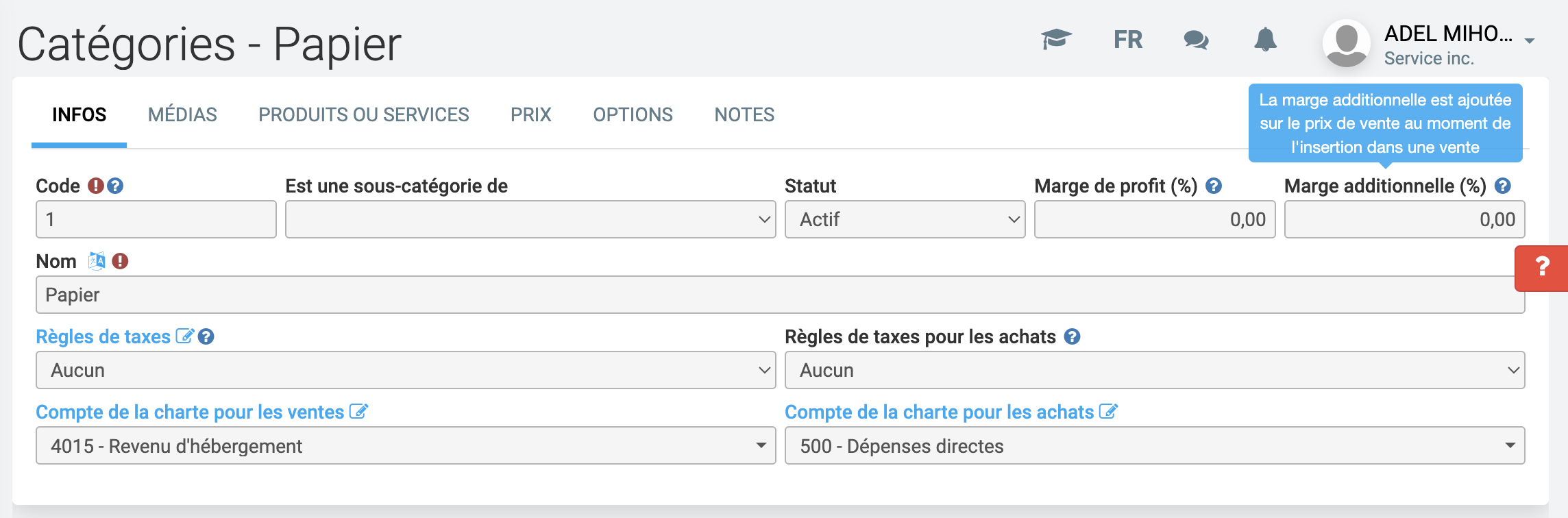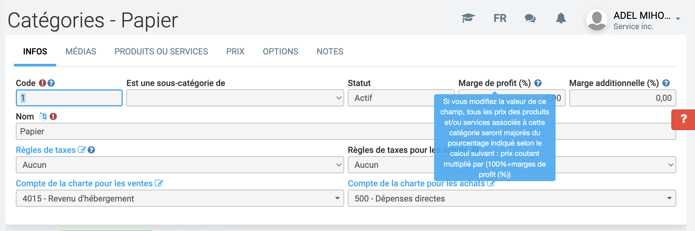 Comme vous le savez déjà, la catégorie permet d'appliquer les mêmes caractéristiques aux produits et services qu'elle contient. C'est le cas de la marge de profit. Dès que le pourcentage de ce champ est différent de zéro, la fonction s'enclenche pour l'ensemble des produits et services de cette catégorie.