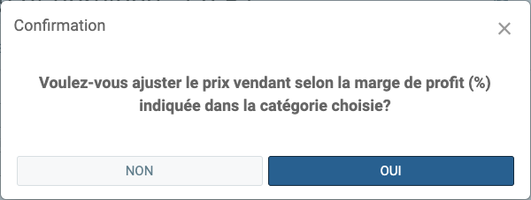 En répondant par la positive, le prix de vente régulier sera majoré de 10% tel que défini dans sa catégorie. Dans le cas où vous ne seriez pas certain ou que vous préférez ajuster manuellement le prix de vente régulier, cliquez sur Non.