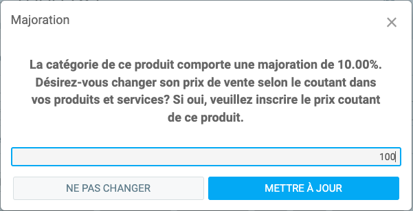 Une boite de dialogue vous permet d'ajuster à la volée le prix coutant de l'article et de majorer automatiquement le prix vendant sur la vente et ajuster les prix de votre produit ou service. Si vous l'avez déjà ajusté sur votre produit ou service, répondez non à la question.