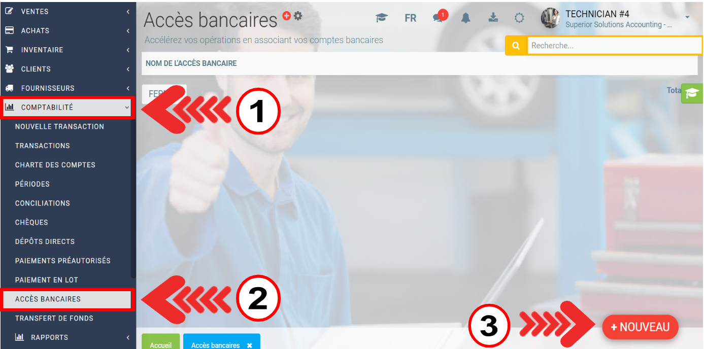 Dans le menu de gauche, cliquez sur Comptabilité > Accès bancaires > +Nouveau.
