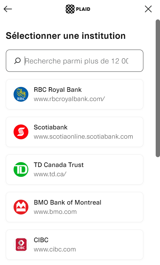 Sélectionnez votre banque. Si le nom de votre banque n'apparaît pas dans la liste, tapez-le dans la case intitulée Recherche parmi plus de 12000.