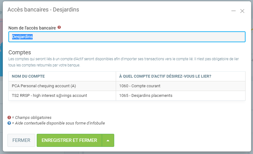 Plus de détail sur l'utilisation de ce module une fois configurée, voir Synchroniser les transactions de mon institution financière