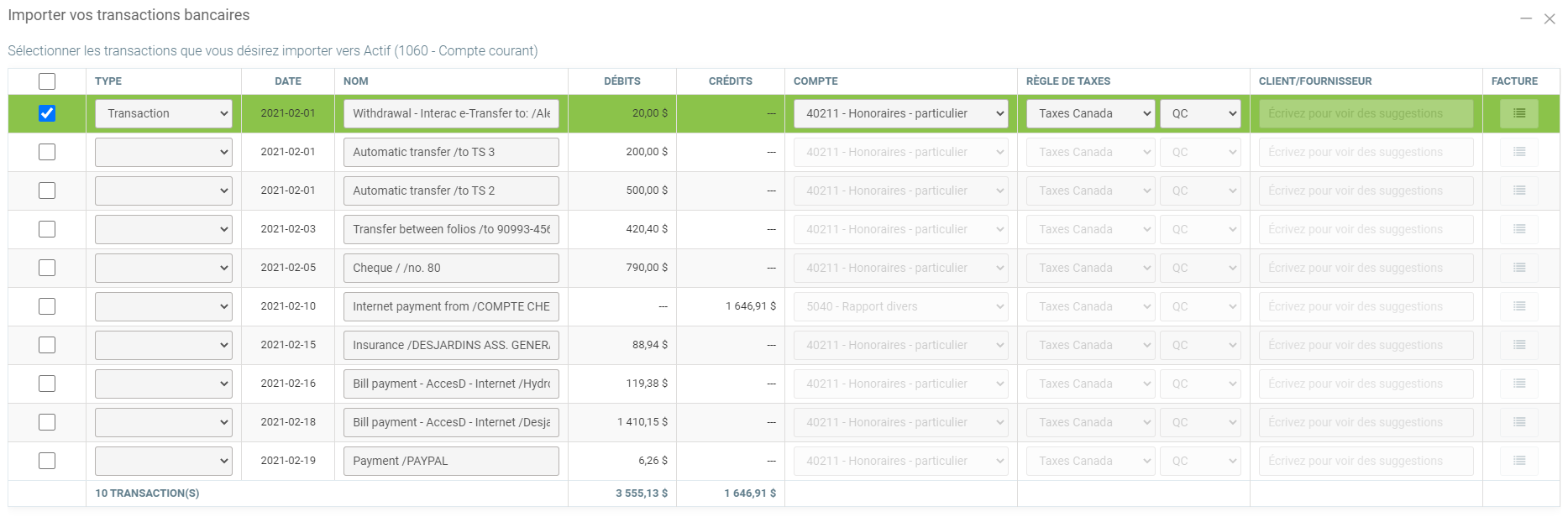 Vos réglages sont enregistrés et deviennent vos défaut lors de vos prochaines importations. Par exemple, si vous associez le compte Carburant et une règle de taxe à votre première transaction d'essence, la prochaine fois que importerez une transaction du même type, le compte et la règle de taxe seront appliqués par défaut.
