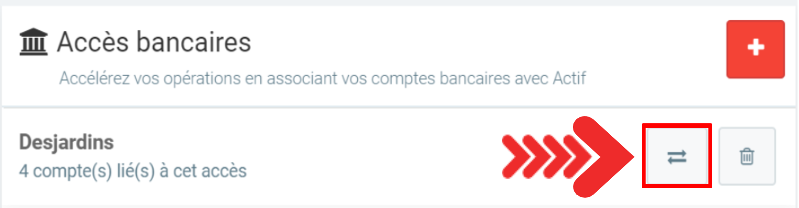Lorsque le jumelage de votre accès bancaire est complété, vous pourrez procéder à la synchronisation de vos transactions. Pour se faire, cliquer sur l'icône d'importation sur la ligne de l'accès que vous désirez utiliser.