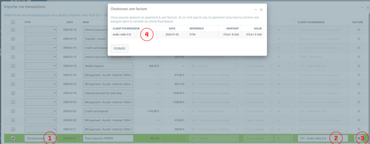 Tous les réglages que vous utilisez sont enregistrées et seront affiché par défaut lors de la prochaine importation. Par exemple, pour une transaction d'essence, vous associer le compte Carburant et la règle de taxe appropriée, la prochaine fois que importerez vos transactions, Actif va automatiquement appliquer le compte et les taxes pour ce type de dépenses.