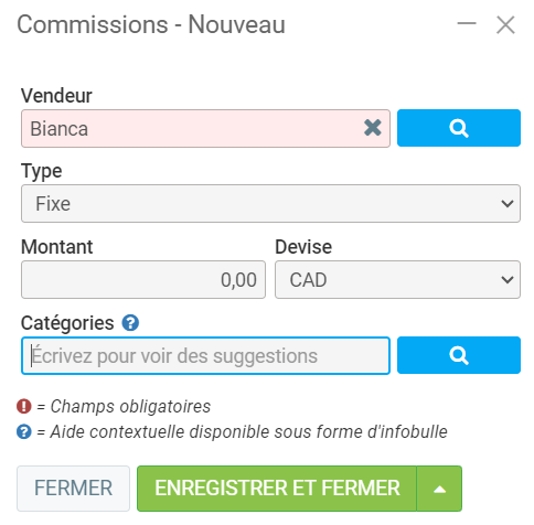 Peu importe la méthode (clients ou ressources humaines), le processus de configuration est le même. Pour ajouter une commission, rendez-vous dans la liste spécifiée dans la méthode que vous avez choisi, et cliquer sur le +. La fenêtre suivante apparaitra.