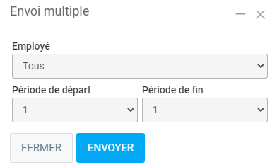 qui se trouve dans le bas de la liste. Ce bouton sert à envoyer plusieurs bulletins au même moment. Cela vous demandera de choisir la période et le ou les employés à qui envoyer les bulletins.