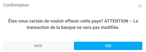 Si vous optez plutôt pour la suppression de la paye, cliquez sur la poubelle au bout de la ligne de celle-ci, un message comme celui-ci vous sera affiché :
