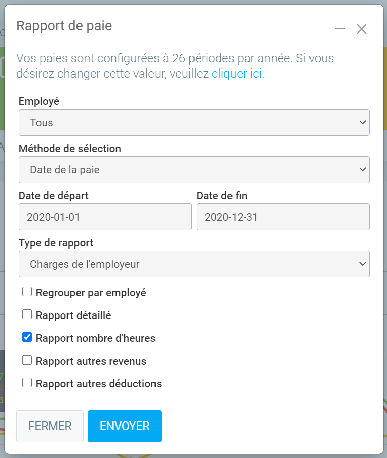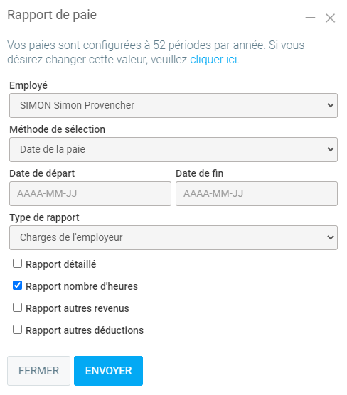 Note : S'il vous "manque" une paye pour un employé, c'est que la date d'embauche doit être antérieure à la date de début de période de la paie. En effet, un employé peut être embauché à plusieurs reprises et cela ne doit inclure que les payes de la période d'embauche courante.