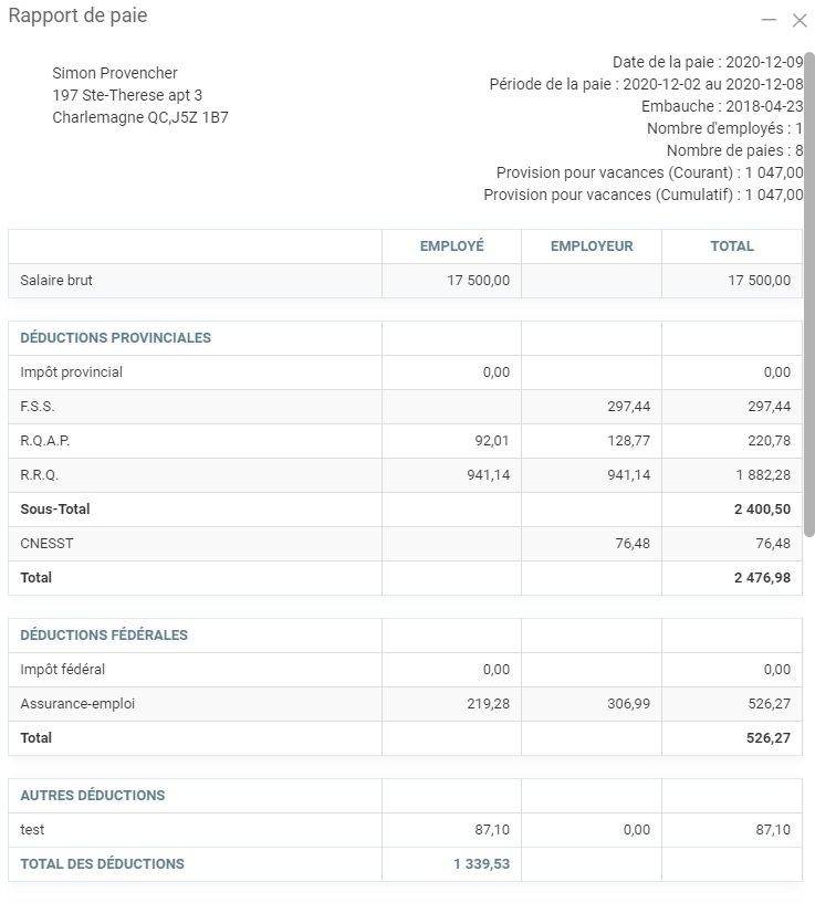 Afin de voir les cumulatifs, choisissez l'employé pour lequel vous désirez faire une paie de cessation, et puis insérez la période de paie pour laquelle il a travaillé chez vous. Vous pouvez simplement vider les champs "Date de départ" de "Date de fin" pour que l'ensemble des paies soient incluses dans le rapport. Vous pouvez ensuite cliquer sur Envoyer afin de produire le rapport. Voici un exemple de rapport que cela va produire :