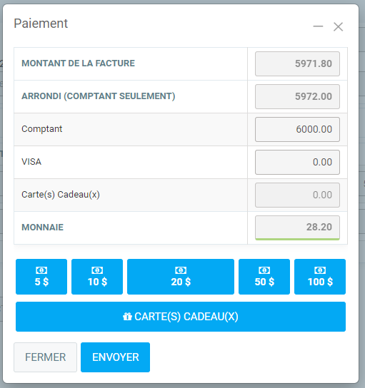 Lorsque vous cliquez sur ce bouton, la fenêtre de paiement sera affichée. Celle-ci vous présentera le montant à payer et les méthodes de paiements en dessous. Il y a aussi des boutons rapides pour entrer des billets comptants (Ajoute simplement le montant indiqué à la ligne 'Comptant'). Pour le bouton cartes cadeaux, veuillez consulter la FAQ du même nom pour en savoir plus. Lorsque vous avez choisis les valeurs de paiements du client (et que le total de ceux-ci égalise ou dépasse le montant à payer), le bouton 'Envoyer' sera déverrouillé. Si le client à payer plus que le montant demandé, la case 'Monnaie' indiquera le montant à remettre au client.