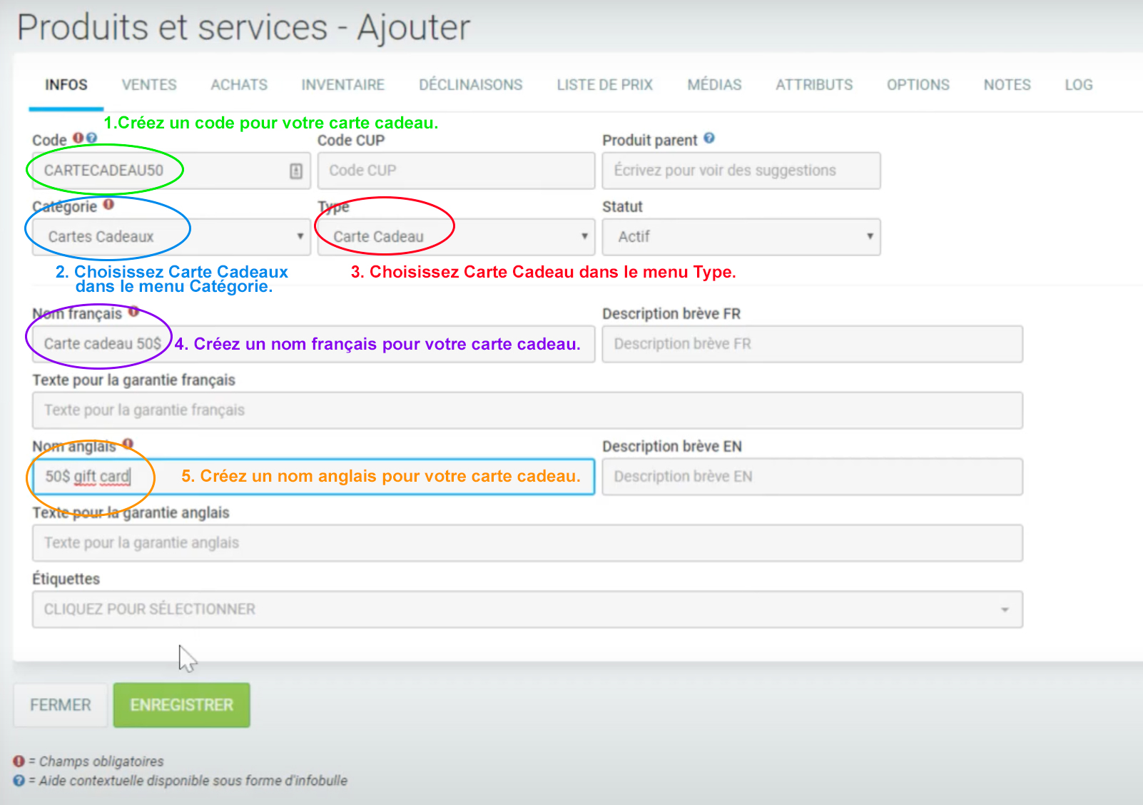 4. Nom français - Entrez le nom que vous voulez donner à votre produit en français (p. ex. : Carte cadeau de 50 $).