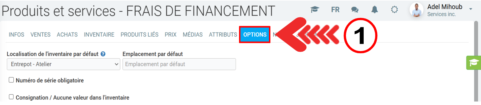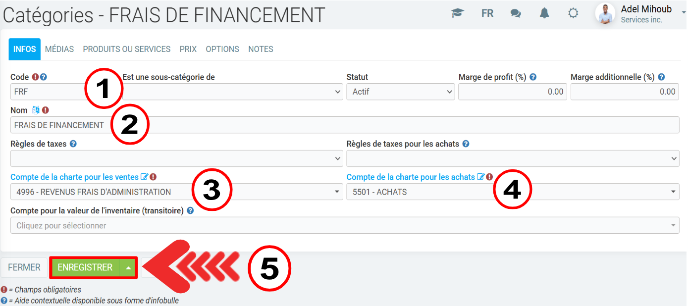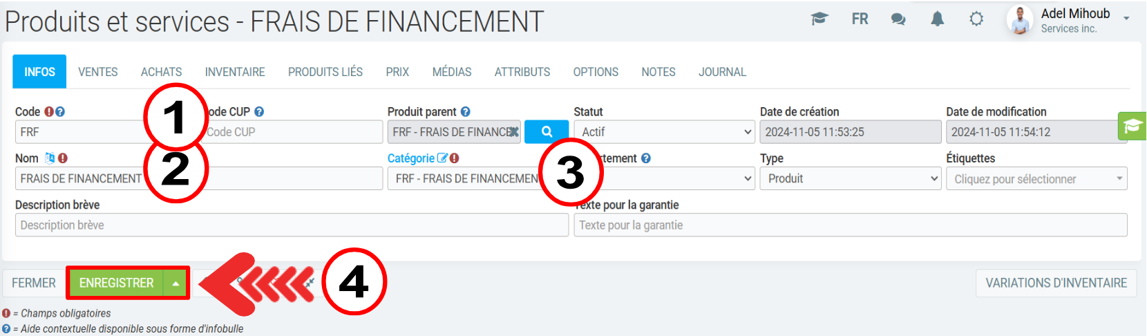 Pour le code, vous devez choisir FC - Frais financiers ou FRF - Frais de financement. Veillez à ce que le code soit unique dans la liste des produits et services.