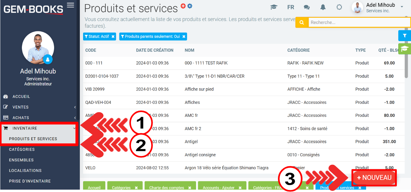 Allez dans le menu de gauche et cliquez sur Inventaire > Produits et services > Nouveau.