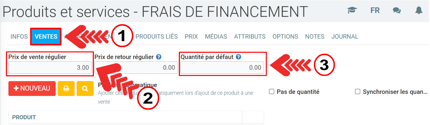 3) Après l'avoir sauvegardé, dans la même fenêtre, cliquez sur l'onglet Ventes pour définir le montant des frais financiers.