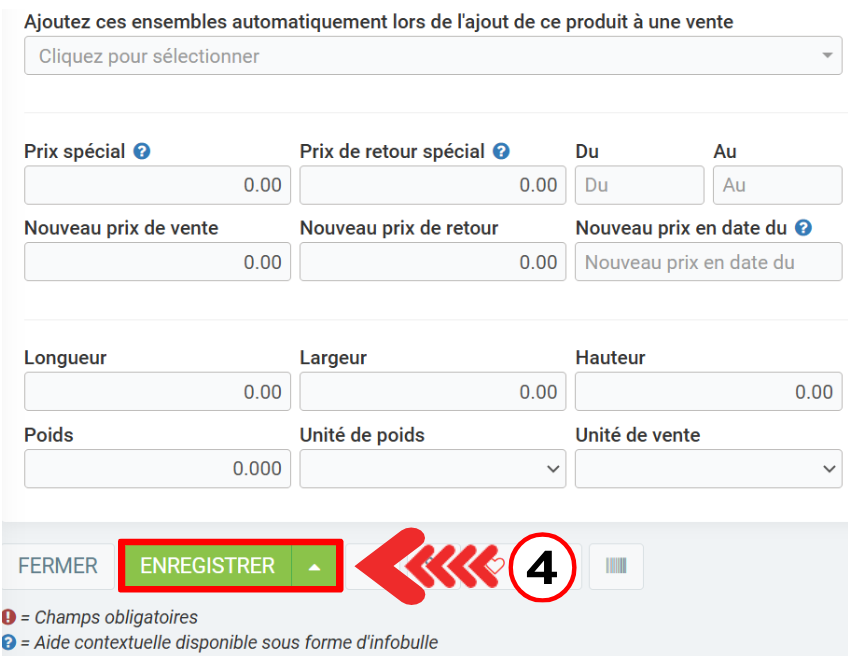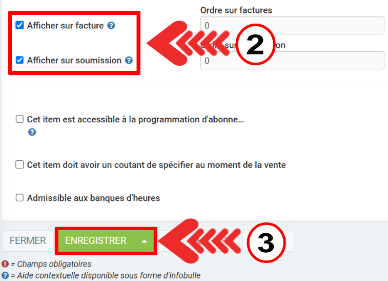 - Cochez ou non les cases ''Afficher sur facture'' et ''Afficher sur soumission''.