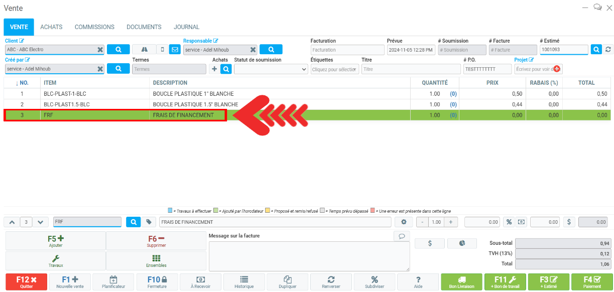 Créez un estimé, puis ajoutez le travail: FRF Frais de financement une fois que vous avez confirmé que le client paiera par carte de crédit.