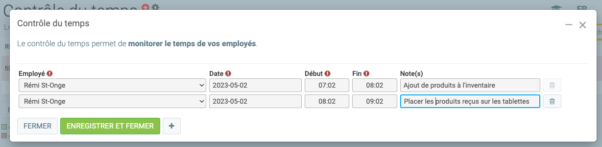 À remarquer le bouton plus (+) dans le bas qui permet d'ajouter plus d'une entrée de temps pour un ou plusieurs employés d'un coup.