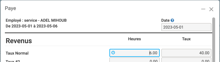 À la création de la paie pour un employé, si celui-ci a du temps d'inscrit dans le contrôle du temps pour cette période de paie, le total des heures de la période sera transposé dans le champ Heures #1. Un clique sur la petite horloge vous permettra même du consulter le rapport des heures trouvées.