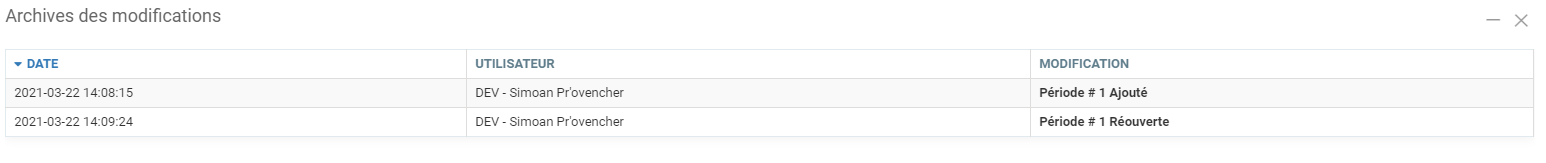 On voit dans ce rapport que l'utilisateur DEV a ajouté une période # 1 en date du 22 mars 2021, et 1 minute après, le même utilisateur a retiré cette période.