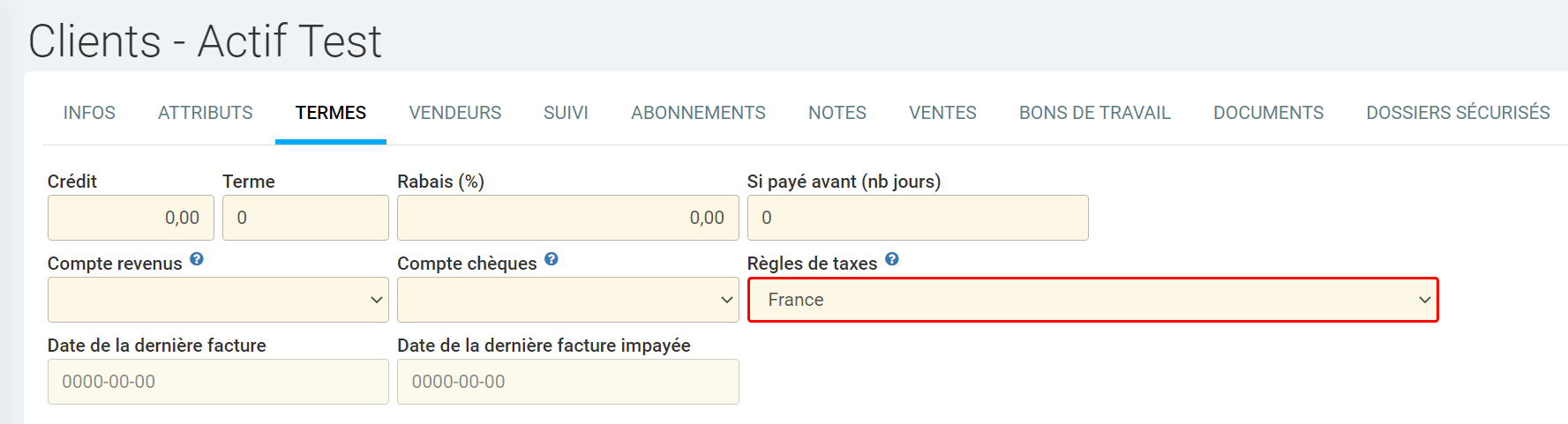 Il est possible d'outre-passer la règle par défaut du système pour certains clients ou fournisseurs (par exemple pour un client étranger qui ne doit pas payer les taxes locales). Pour ce faire, rendez-vous dans l'onglet "Termes" des fiches clients ou fournisseurs et indiquer la règle de taxe à appliquer.
