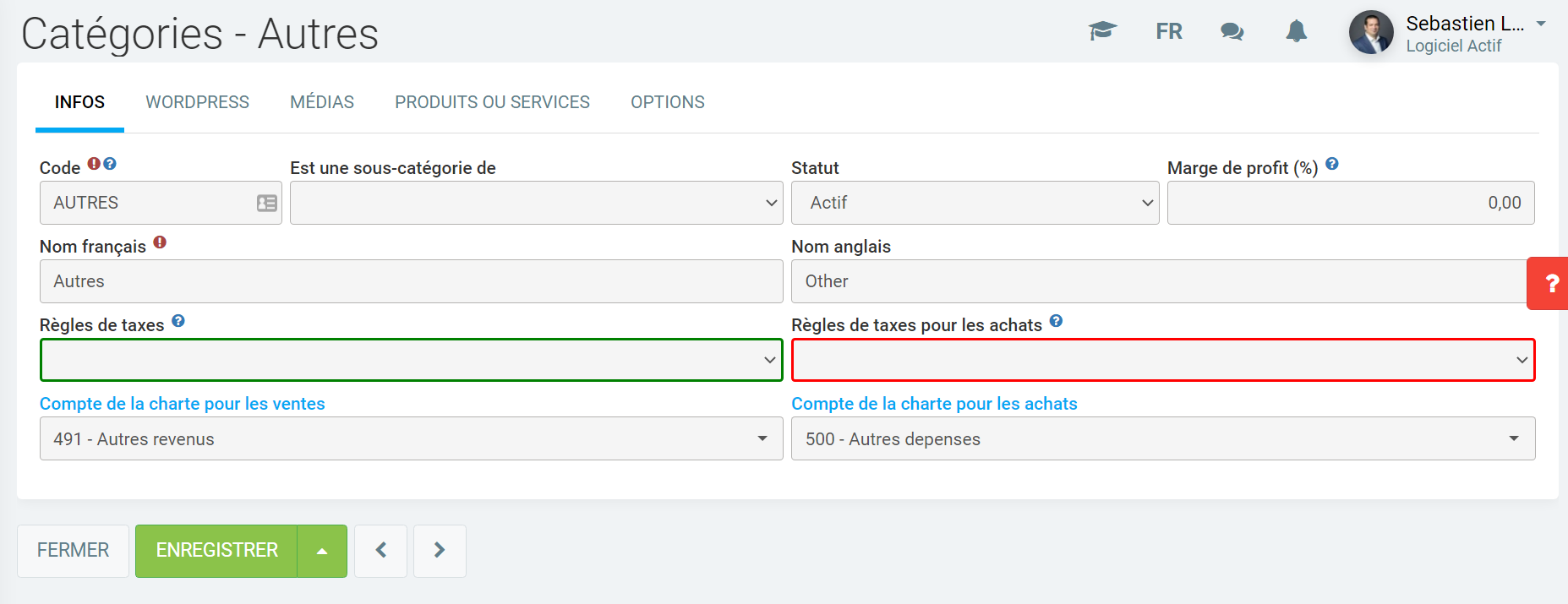 Il est également possible d'outre-passer la règle par défaut du système pour certaines catégories de produits ou services. Pour ce faire, rendez-vous dans le menu Produits et services->Catégories et choisissez une catégorie.