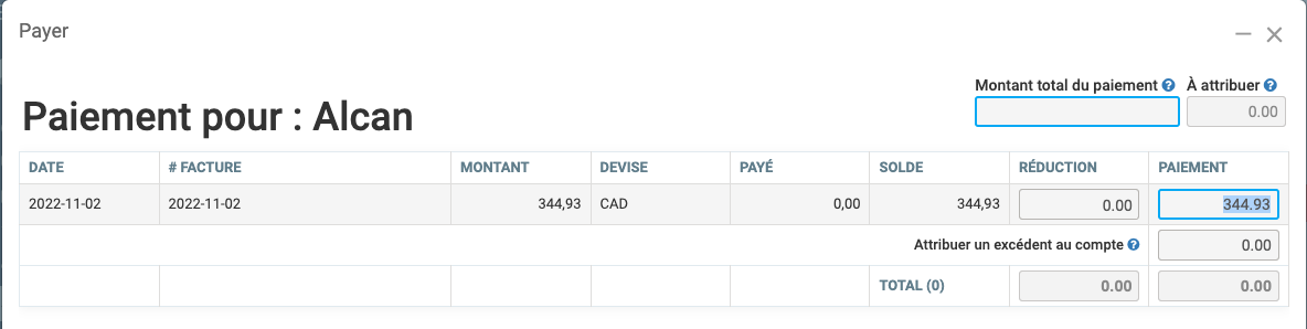 Cliquez sur la case paiement pour reporter le solde de la facture que vous pourrez ajuster au besoin.