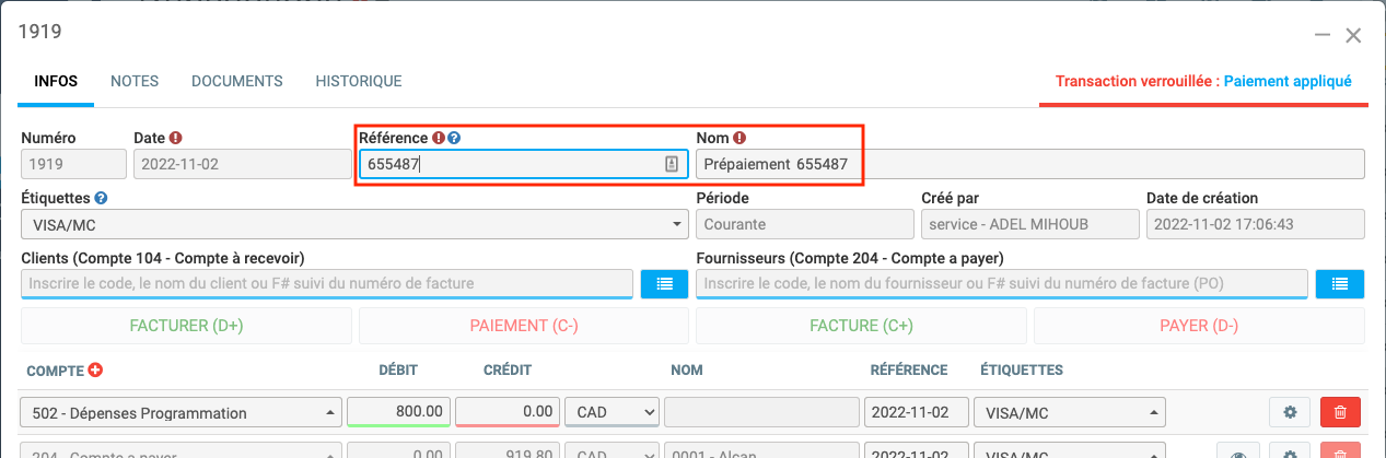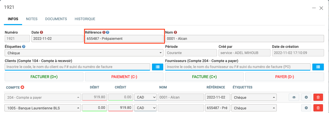 Inscrivez aussi le numéro de la facture dans la référence de paiement et refermez les deux transactions en vous assurant d'enregistrer.