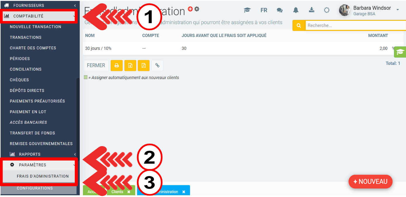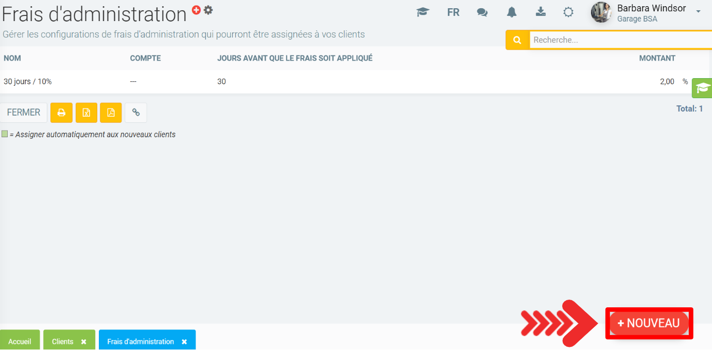 C'est à cet endroit que vous allez pouvoir définir vos règles de frais d'administrations que vous pourrez par la suite assigner à vos clients.