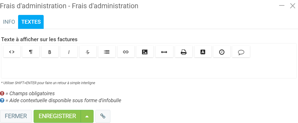 Dans l'onglet Textes, si vous souhaitez afficher un texte sur les factures de vos clients qui ont cette charge, vous pouvez l'écrire dans ce champ.