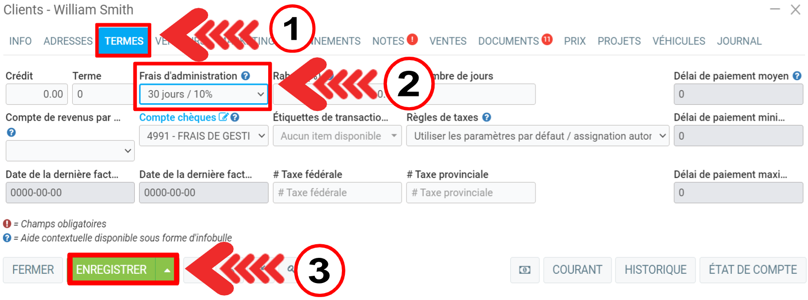 Pour vérifier cette fonctionnalité, cliquez sur Clients > Clients et sélectionnez le fichier que vous souhaitez ouvrir. Cliquez sur l'onglet Termes.