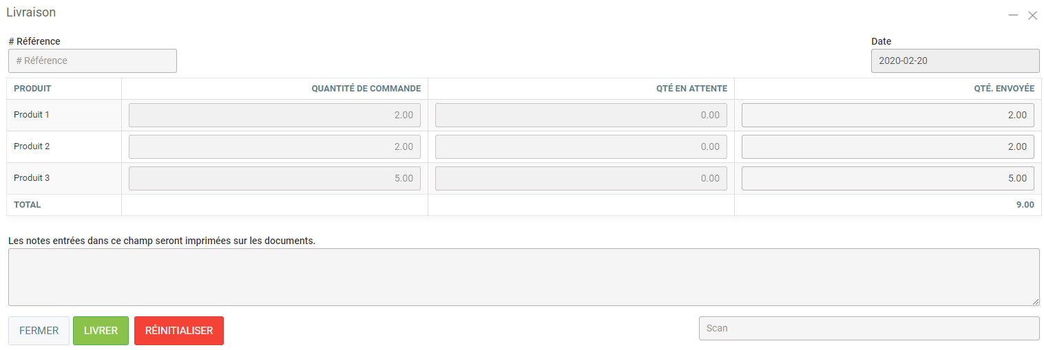 Par défaut, vous verrez que la colonne QTÉ. ENVOYÉE est automatiquement remplie par la quantité totale en attente. Si vous modifiez les quantités, la colonne QTÉ EN ATTENTE sera ajustée en conséquent. Vous pouvez inscrire la référence de la livraison, la date et aussi des notes à afficher sur le bon de livraison. Ce module permet de scanner les codes à barres si vous désirez procéder de cette façon.