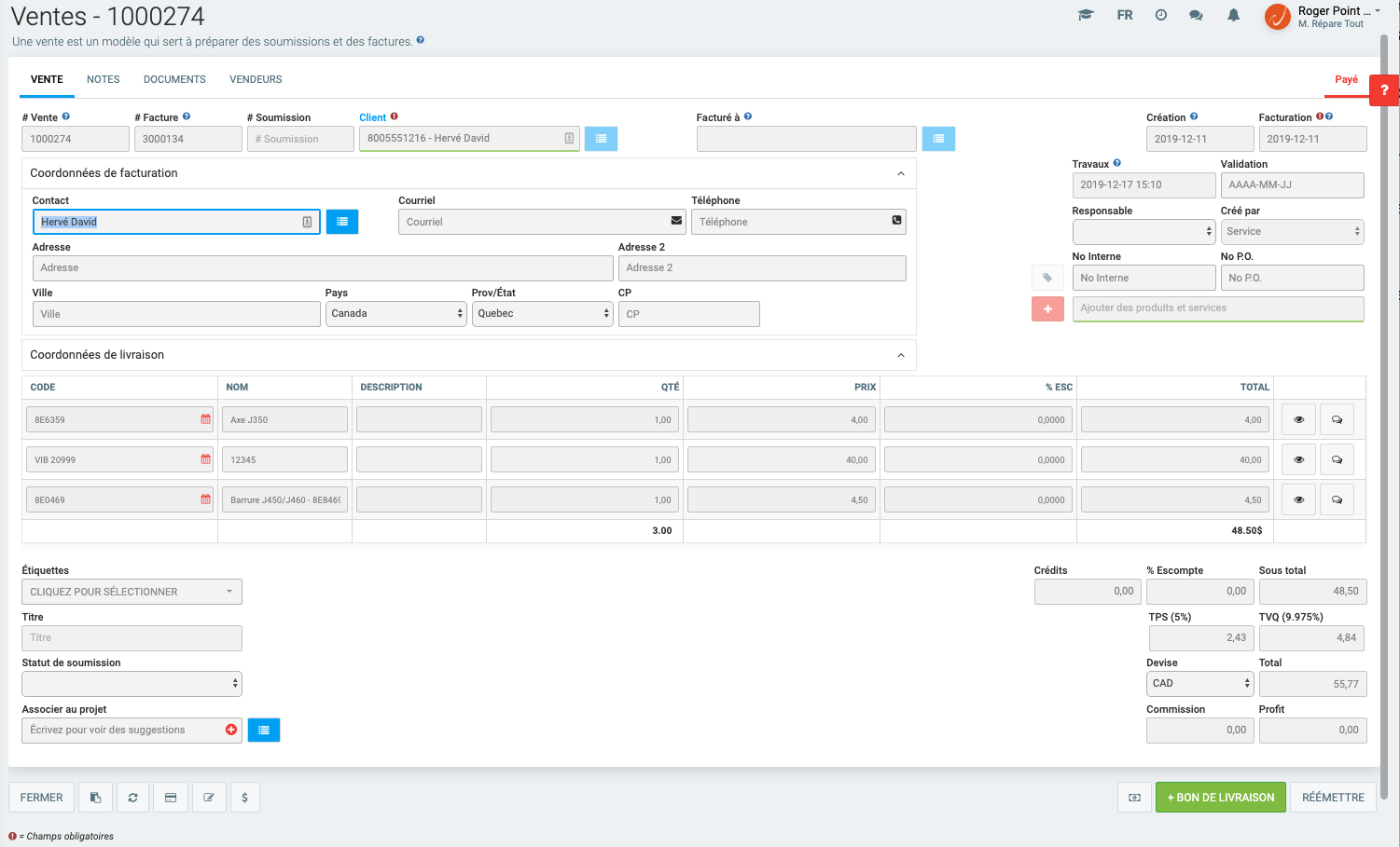 Vous cliquez maintenant sur la ligne qui s'affiche pour amener la Vente numéro 1000274 à l'écran...