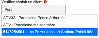 Dans la case Veuillez choisir un client, commencer à saisir les premières lettre du nom du client et sélectionnez-le parmi les options proposées :