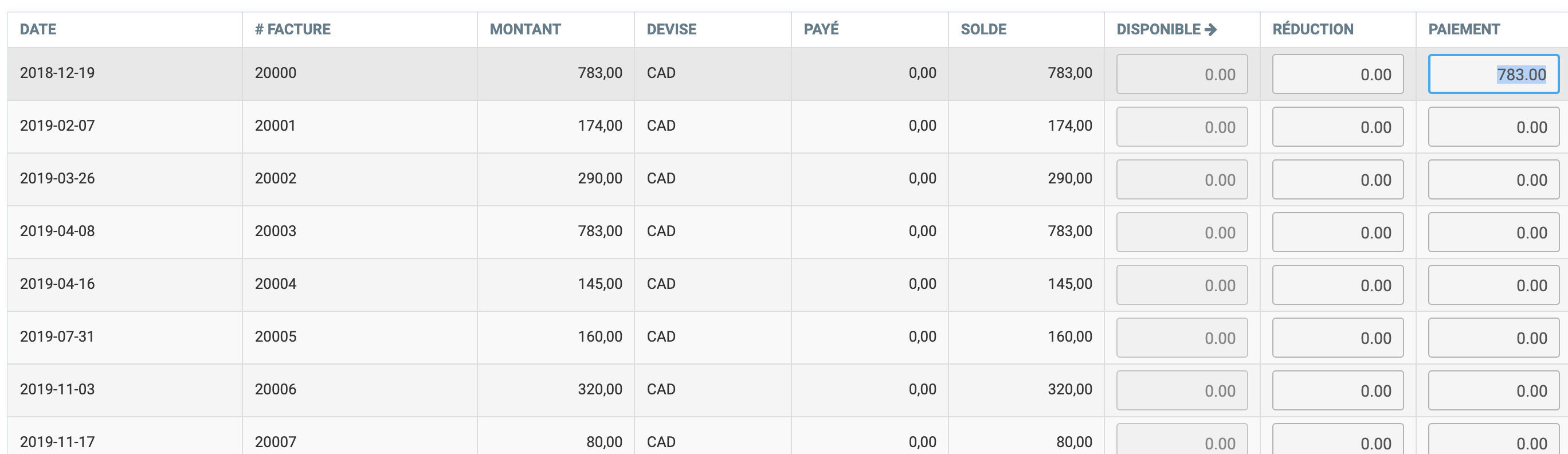 Cliquez dans la case paiement à droite correspondante à la facture à encaisser. Le montant de la facture s'inscrira aitomatiquement.