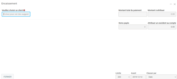 Il existe un bouton d'encaissement sur la fiche d'un client et sur la vente. Vous pouvez accéder au même écran en cliquant sur Clients dans le menu de gauche et sur Encaisser.
