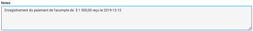 Utilisez la section des Notes pour préciser que le paiement enregistré correspond à un acompte pour une facture qui n'a pas encore été générée.
