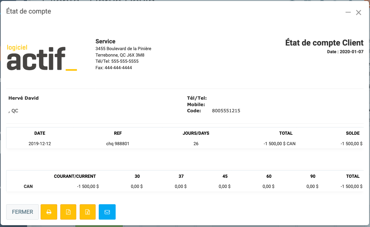 Afin de vérifier que le paiement a été encaissé et que la somme reçue apparaît dans le compte de votre client, utilisez le bouton État de compte de la fiche de votre client.