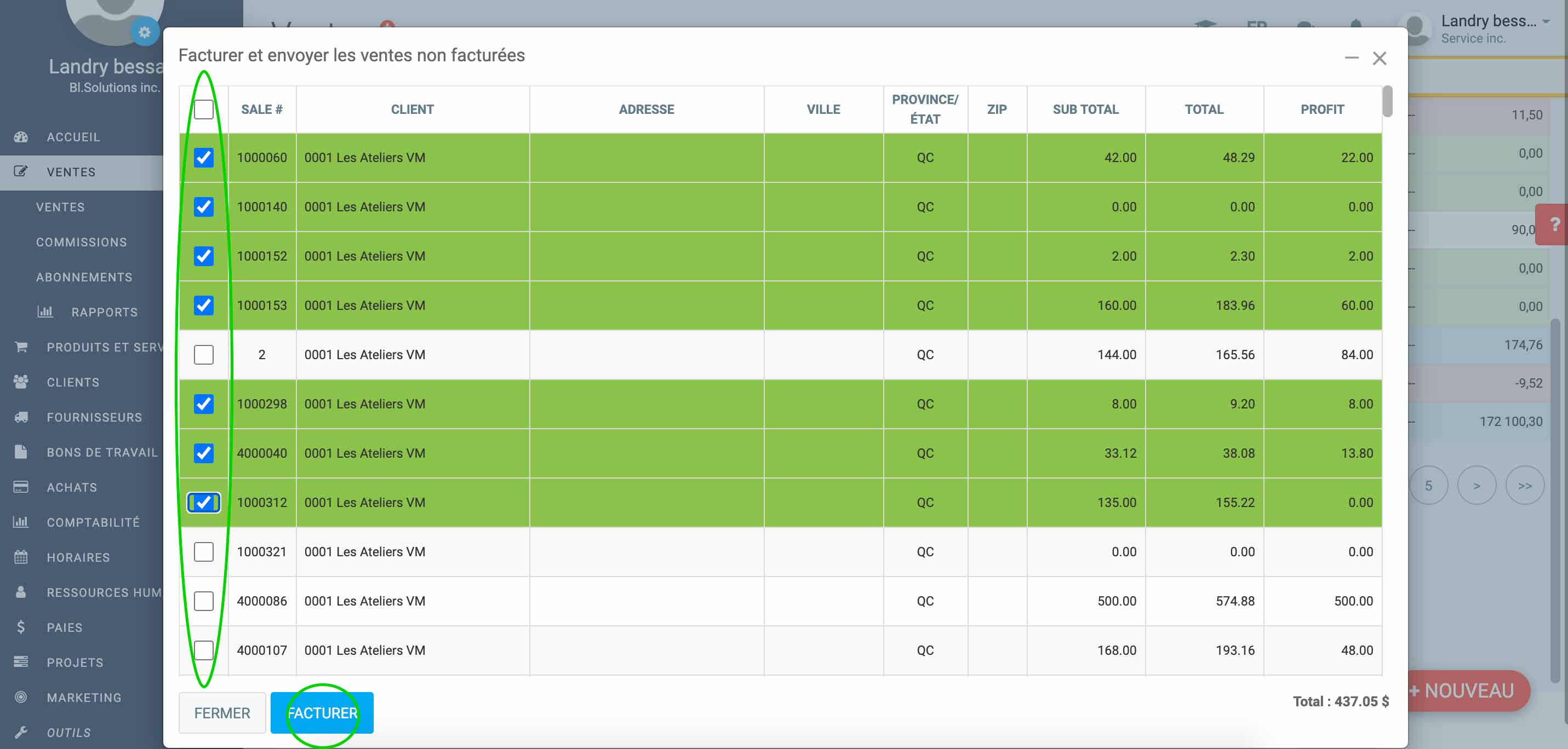 Une liste de toutes les ventes non facturées apparaîtra à l'écran. Cochez les ventes que vous désirer facturer et cliquez sur le bouton Facturer pour envoyer les factures aux clients. (Voir image ci-dessous.)