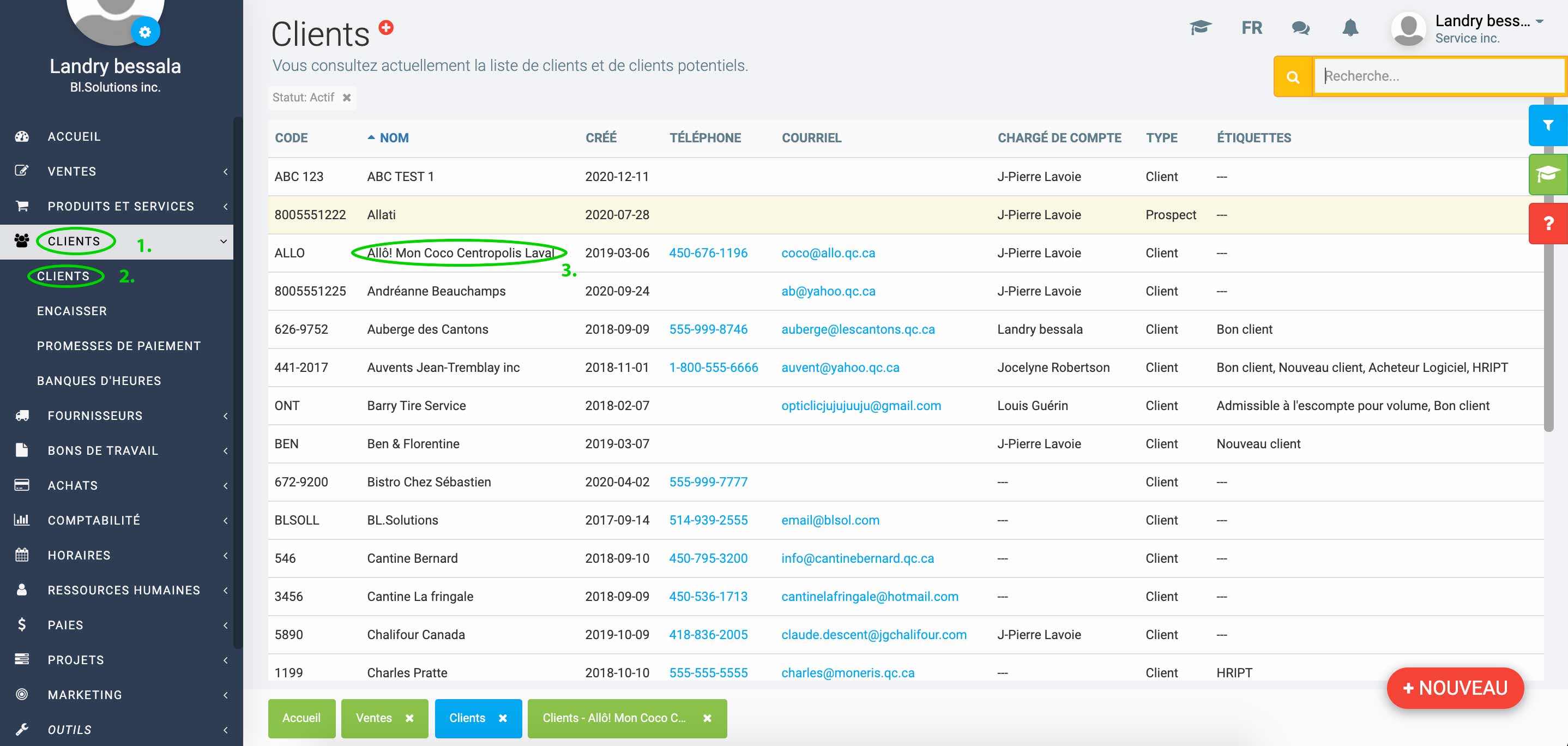 Si vous avez déjà facturé vos ventes et que vous désirez envoyer un lot de factures à un client, cliquez sur Clients > Clients dans le menu de gauche. Puis, dans la liste des clients, cliquez sur le client à qui vous désirez envoyer des factures. (Voir image ci-dessous.)