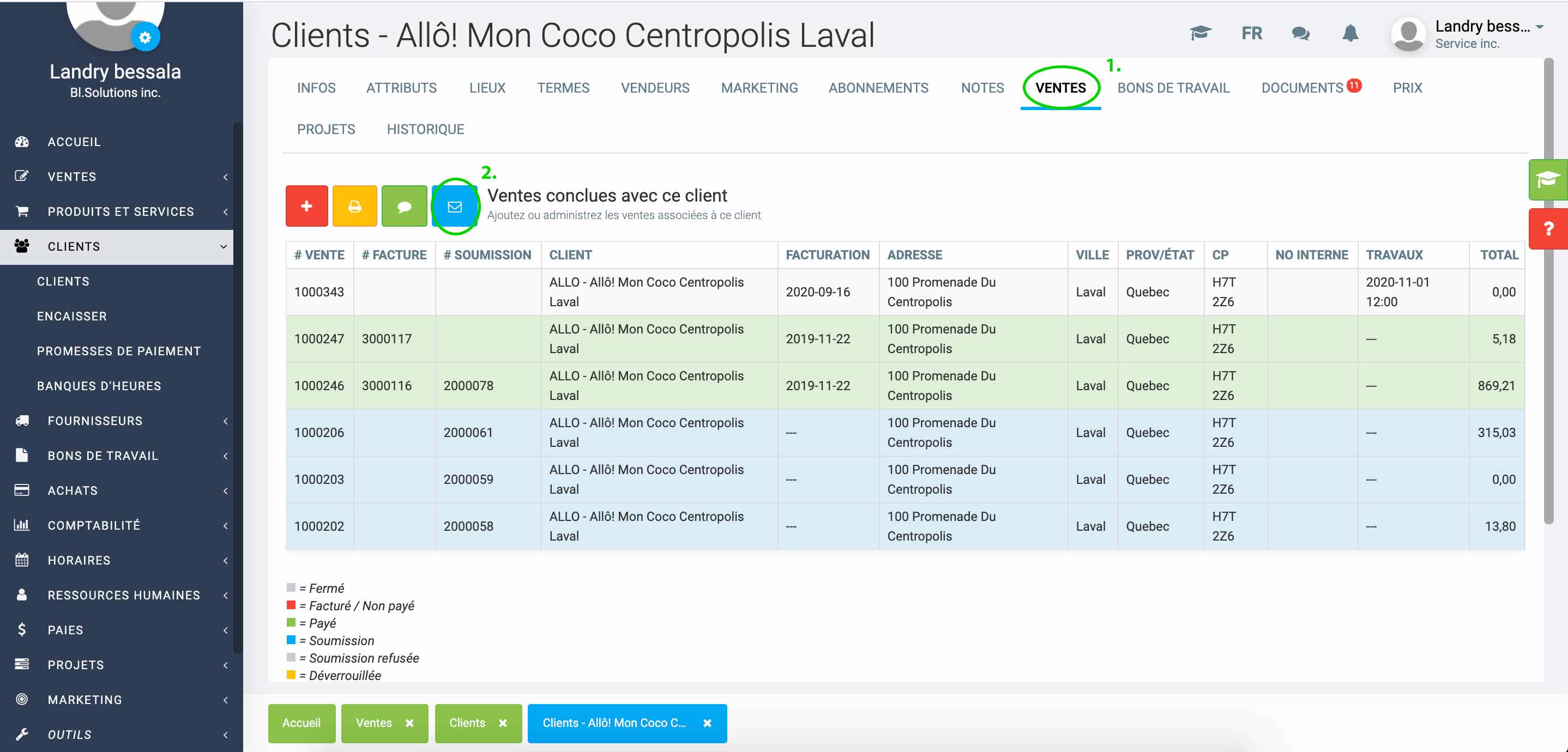 La fiche du client apparaîtra à l'écran. Cliquez sur l'onglet Ventes et ensuite sur l'icône bleue représentant une enveloppe. (Voir image ci-dessous.)