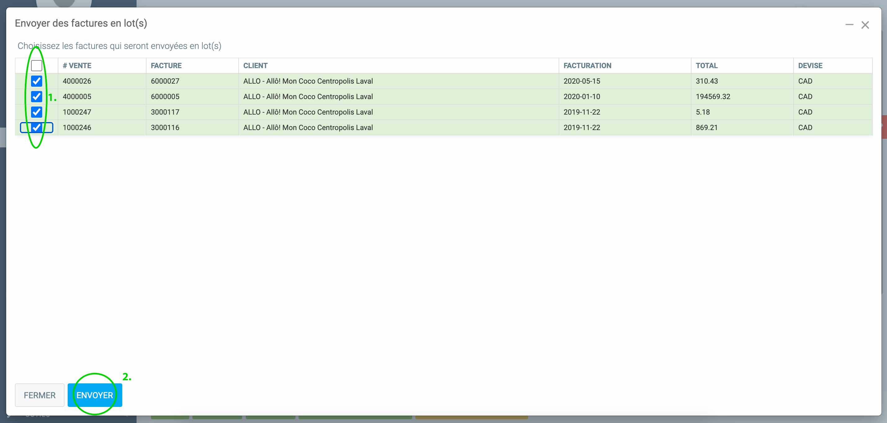 Une liste des factures du client apparaîtra. Cochez les factures que vous désirez lui envoyer par courriel et cliquez sur Envoyer. (Voir image ci-dessous.)