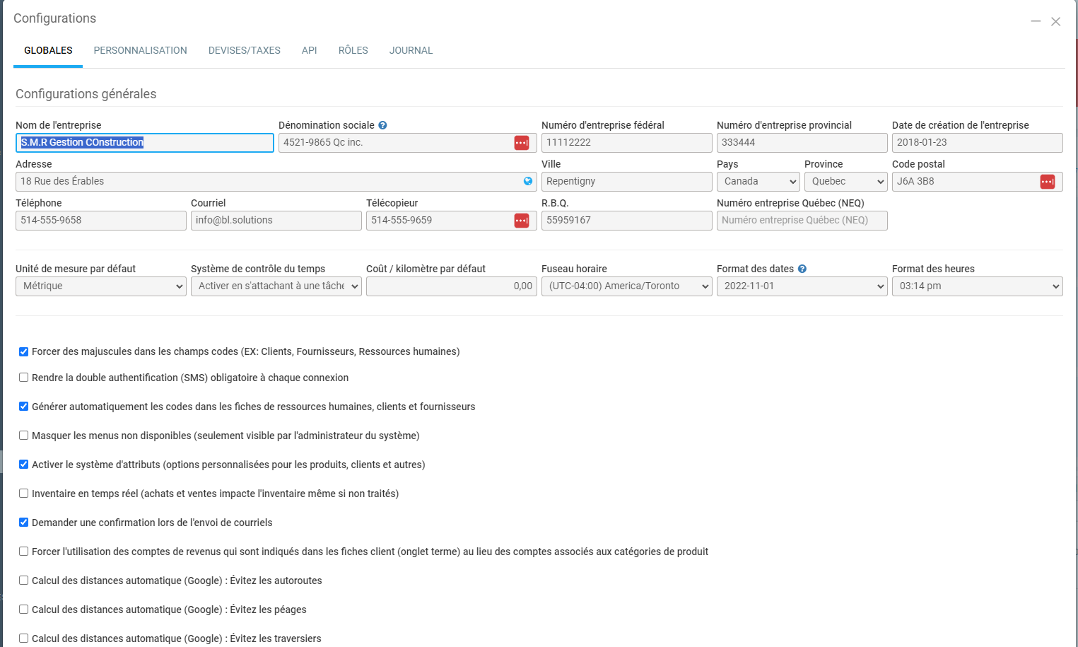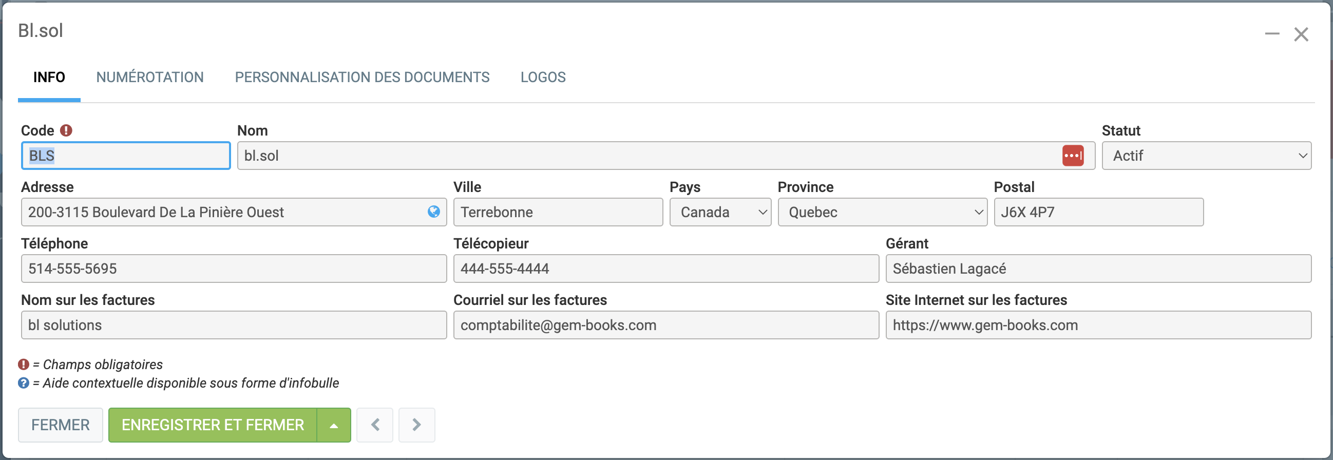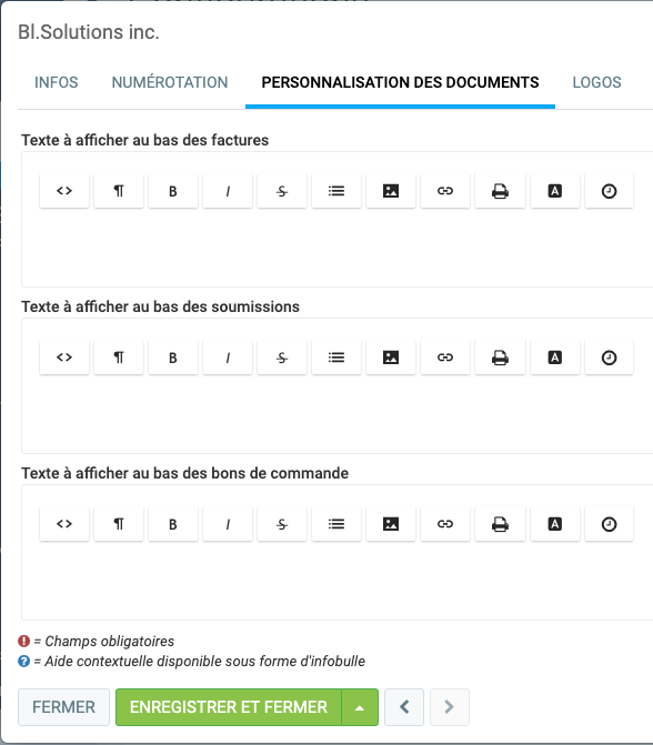 Il est possible de modifier vos factures, soumissions ou bons de commande pour ajouter de l'information additionnelle. C'est aussi sur ses configurations que vous pourrez ajuster les informations qui apparaissent sur la facture en cas de changement d'adresse par exemple.