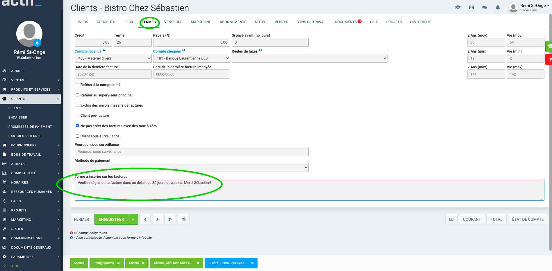 Dans la fiche du client, cliquez sur l'onglet Termes. Entrez votre message dans la boîte Terme à inscrire sur les factures.