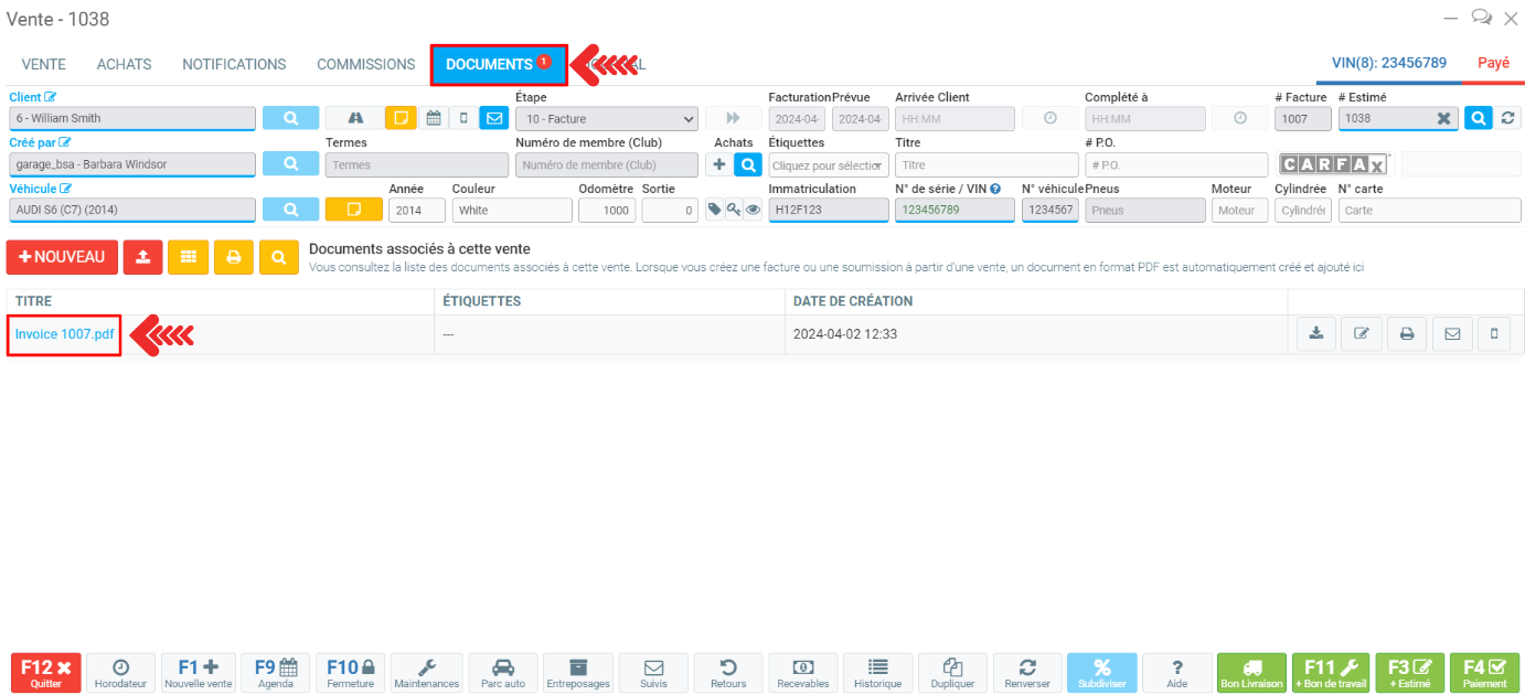 Note: Lorsque vous survolez le bouton, qui apparaît en bas,à la droite de l'écran, vous remarquerez que GEM-CAR vous indique déjà que vousdevrez identifier les items qui ne seront pas facturés immédiatement et quidevront être transférés dans une nouvelle vente.