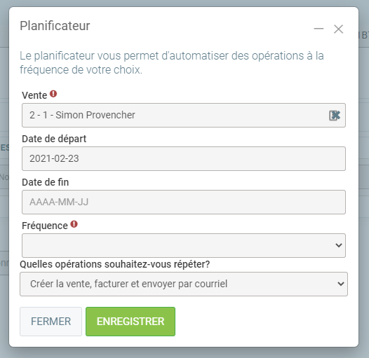 Vous allez pouvoir inscrire la période à laquelle vous voulez que les récurrences se génère (vous pouvez laisser les dates vides si vous désirez que cela se fasse sans limite), et la fréquence de la réccurence. Les choix de fréquence sont les suivants : Quotidien, Mensuel et Annuel. Dans le bas du module, il va parfois y avoir des choix concernant le module choisi. Dans l'exemple, vu que l'opération est liée à une vente, le système demandera si on veut que la vente soit seulement créé, créé et facturé, ou bien créé, facturé et envoyé au client.